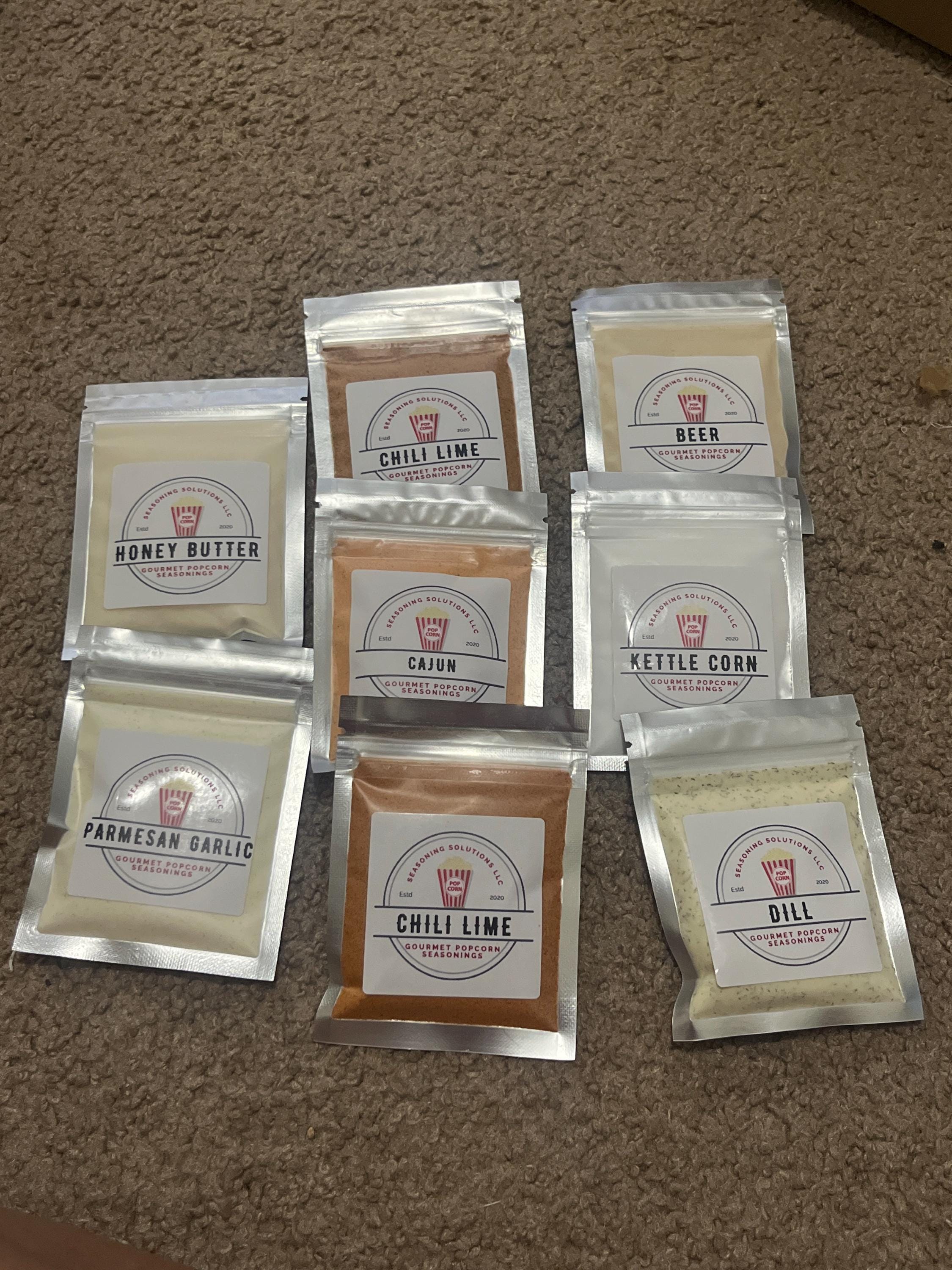 Flavor Seasonings Available: Movie Theatre Butter, Beer, Parmesan Garlic, Honey Butter, Bacon BBQ, Chili Lime, Kettle Corn, Bacon Cheddar, Sour Cream & Onion, White Cheddar(CURRENTLY SOLD OUT of White Cheddar), Cinnamon Roll, Sugar Cookie, Cheddar, Everything Bagel, Sriracha Lime, Cajun, Dill Pickle and Birthday Cake with edible confetti!
